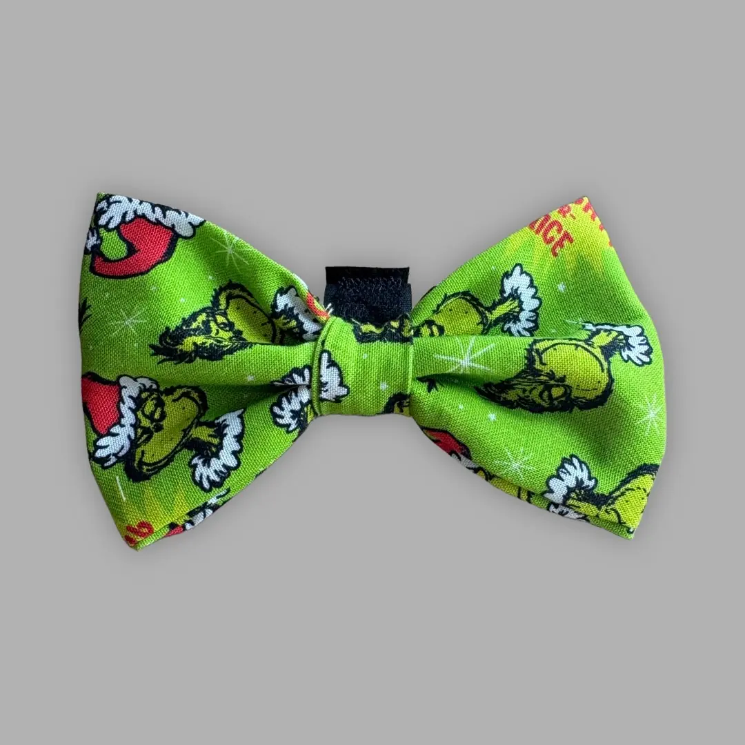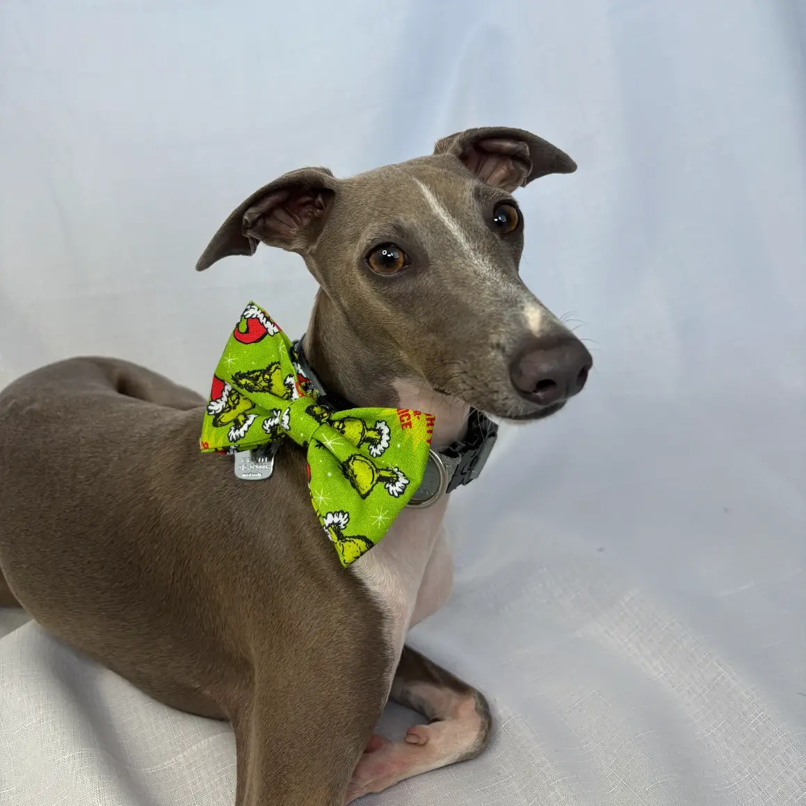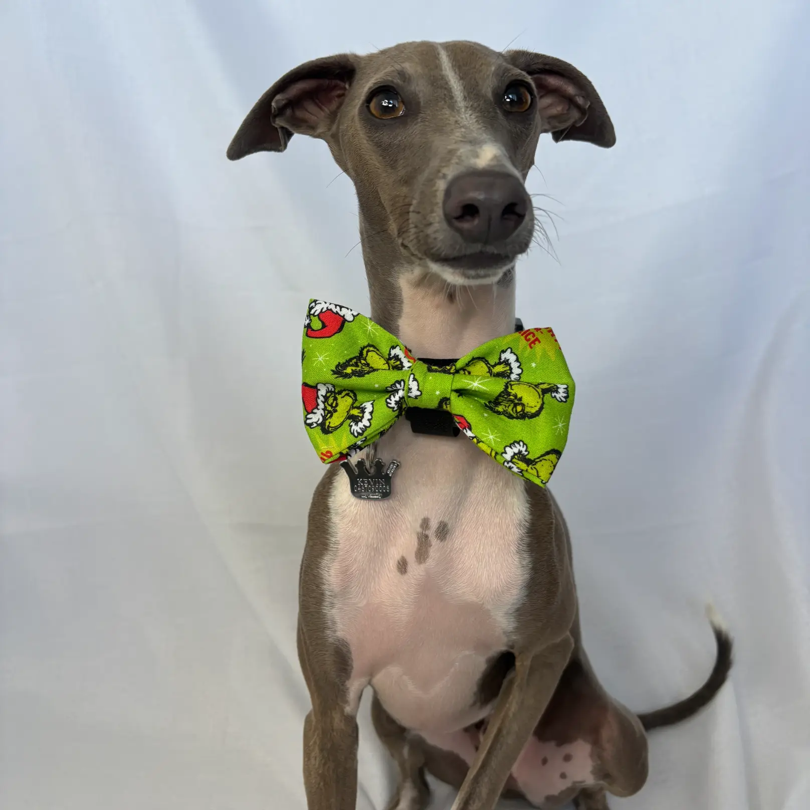 Made from vibrant green fabric featuring playful Grinch illustrations, this bow tie adds the perfect pop of festive fun to any holiday outing or photo. Lightweight, comfortable, and easy to attach to any collar with the velcro back loop, it’s designed for pups who love being the star of Christmas mischief.